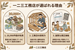 • 工務店の技術力:配管移設や壁撤去も安心。建物の寿命を守る高品質な補強と施工。