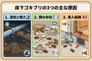 床下でゴキブリが大量発生してしまう根本的な原因を理解することは、効果的な駆除と再発防止の第一歩です。見えない場所でなぜゴキブリが「だらけ」てしまうのか、その主な要因を具体的に解説します。